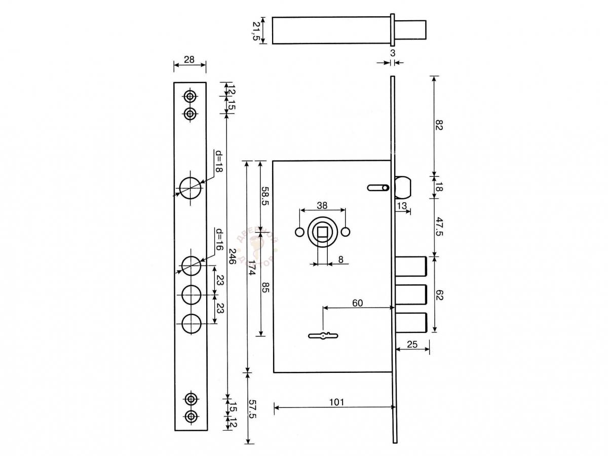 Надійні сувальдні і циліндрові замки для металевих дверей. Відповідність аж до 4 класу по ГОСТ. Лінії продукції: Standard / Premier Представлена ​​тут модель врізного замка T-52-CR Small від Apecs, призначена для монтування в металевих дверях. Замок має видалення ключового отвору в 60 мм, і три циліндричних ригеля діаметром 16 мм, з виносом в 24 мм. Замок відрізняється високою якістю виготовлення, має гальванічне покриття корпусу і деталей. Модель комплектується універсальною засувкою діаметром 18 мм, а кріплення здійснюється через лицьову планку. У комплект входить подовжений гвинт кріплення циліндрового механізму (70 мм). Тип упаковки Коробка призначення Загальна Рекомендований для установки у вхідні двері Так Рекомендований для установки в міжкімнатні двері Ні Тип кріплення Лицьова планка Тип ригелів Циліндричні Кількість ригелів 3 Виліт ригелів 24 мм Діаметр ригеля 16 мм Видалення ключового отвору (Backset) 60 мм Тип механізму секретності Циліндровий Тип циліндрового механізму євроциліндр Комплектація циліндром Чи не комплектується Додатковий механізм секретності Немає засувка Класична Тип засувки Універсальна Міжосьова відстань 85 мм Комплектація ручками Чи не комплектується Автоматичне замикання Чи не автоматичне Кількість точок замикання 1 Покриття лицьової планки Гальваніка Колір лицьової планки Хром