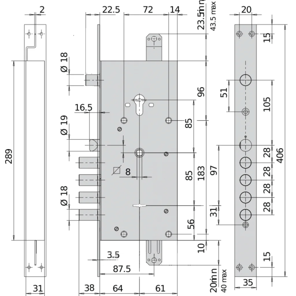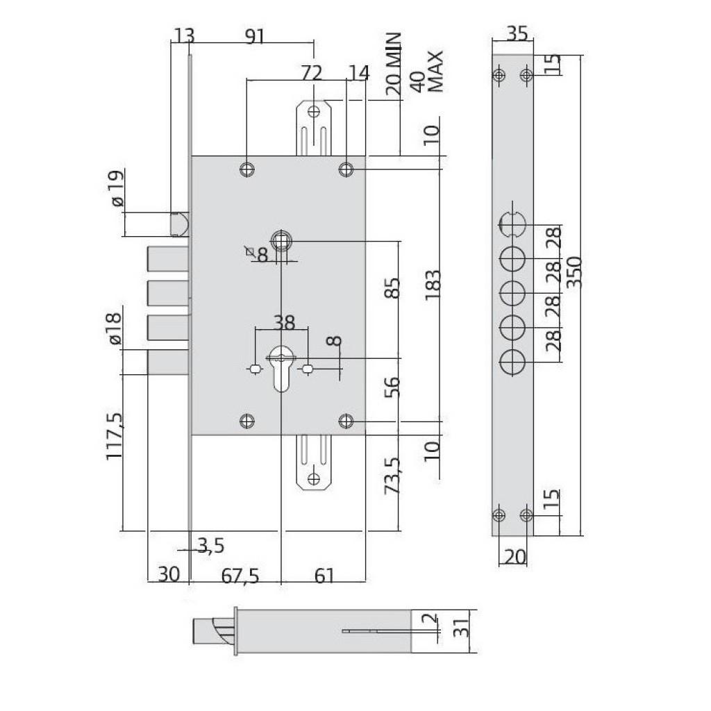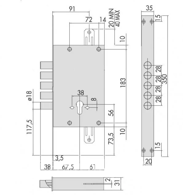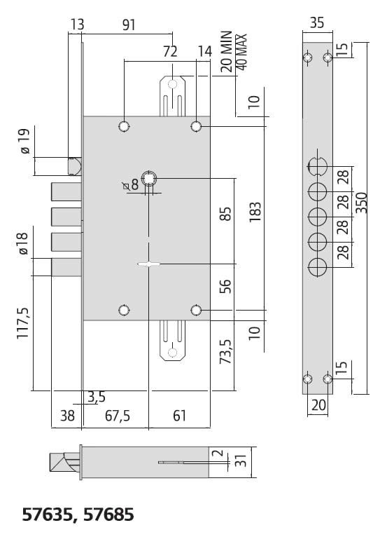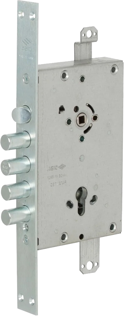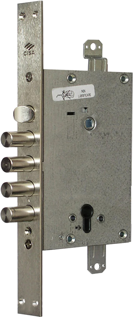 Врізний 6-ти сувальдний, основний замок Cisa тристороннього замикання з засувкою і перекодуванням. Замок призначений для експлуатації в агресивних умовах. Замок обладнаний системою захисту блоку сувальд “ALPS” (All Levers Protection System) ALPS – це система, яка дозволяє захищати сувальдний механізм секретності від найсучасніших і витончених способів розтину замків: “самоімпрессіонного ключа”, класичних відмичок Хоббса, “набірного” ключа і інших спеціальних злодійських інструментів. Принцип функціонування системи заснований на відмінності в роботі оригінального ключа і відмичок. При спробі застосування відмичок і характерного впливу на кодовий механізм замка відбувається миттєве безшумне спрацьовування елементів системи ALPS. Блокування кодового механізму замка гарантовано забезпечує неможливість переміщення засува замка і його відкривання. Володіє вбудованими вузлами, що перешкоджають: злому хвостовика засува – зуби засува мають отвори для захисту від “свёртиша” забивання ригеля в корпус замку – спеціальне блокують пластини. Засув замку витримує фронтальне тиск в 1.000 кг, бічний тиск 600 кг. свердління стійки хвостовика засува – гарт стійки і пакет з пластин. Сукупність усіх застосованих систем надає замкам CISA найвищий захисний потенціал і надає клієнтам сучасний рівень безпеки – як особистої, так і майнової. Чотири ригеля діаметром 18 мм. виліт чотириходового засува 38 мм. Захист від кримінального розтину відмичками. Переворот засувки виконується без розбирання замку. Міжосьова відстань 85 мм. Backset 67,5 мм. Габаритні розміри 203 * 128,5 * 31 мм.