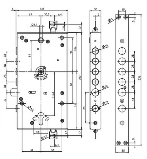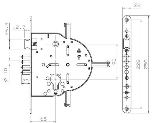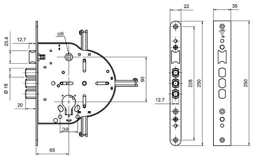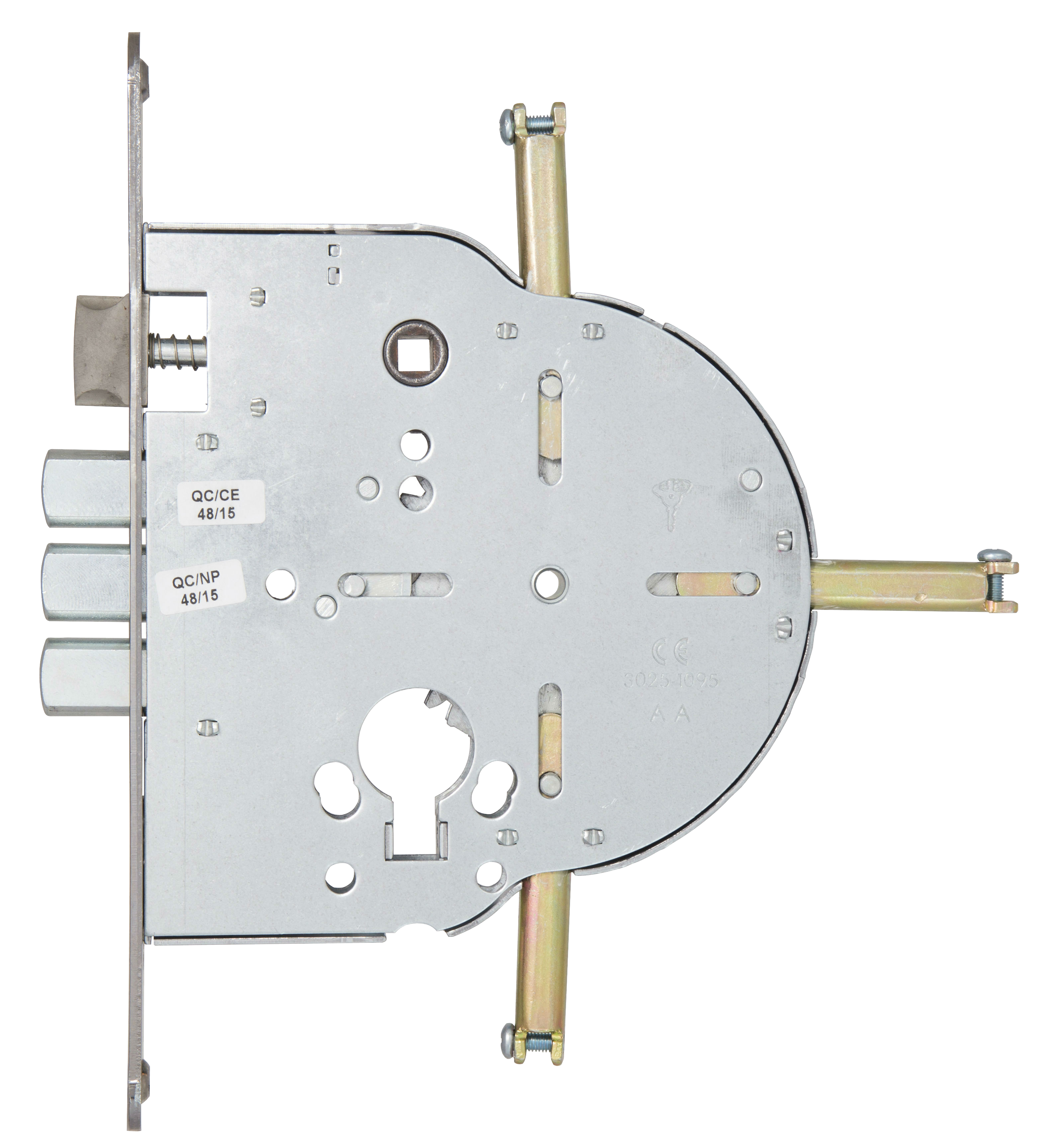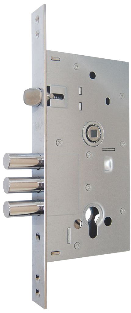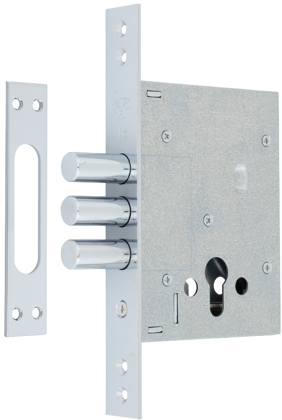 Три сталеві ригелі діаметром 18х12 мм, вихід ригелів – 20 мм, реверсивна засувка з нержавіючої сталі.