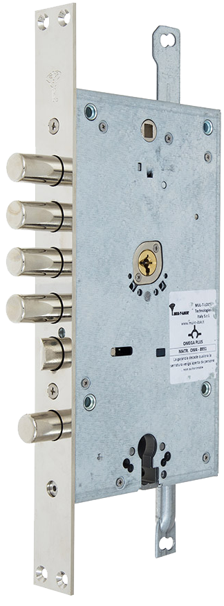 Ізраїльський замок моноблок трехнаправленного закривання MUL-T-LOCK Omega OFMPB3. Оснащений п’ятьма сталевими ригелями 18 мм завтовшки і виходом з корпусу на 30 мм. Замок закривається вбудованим циліндром з унікальним розміщенням пінів в трьох площинах.