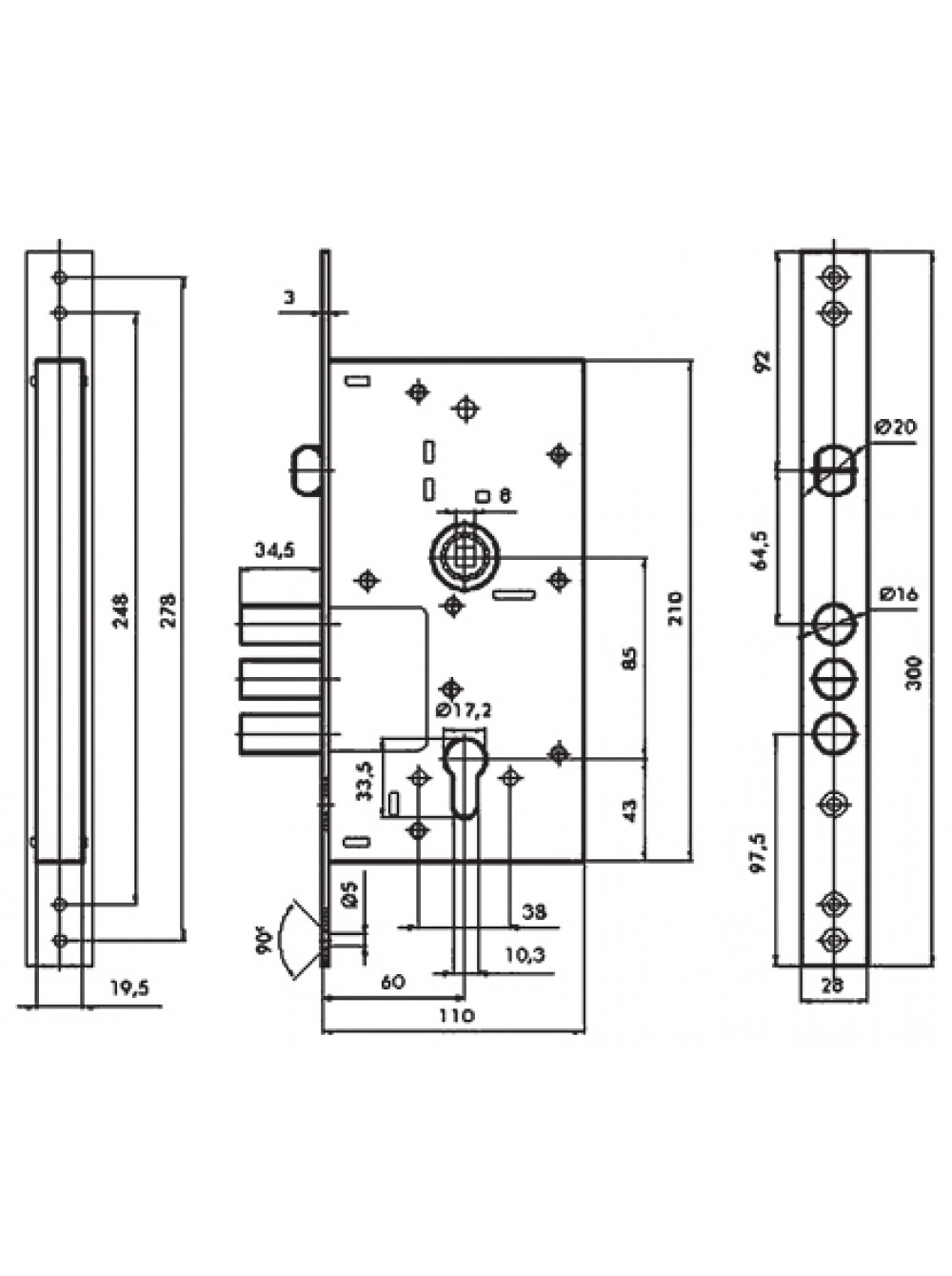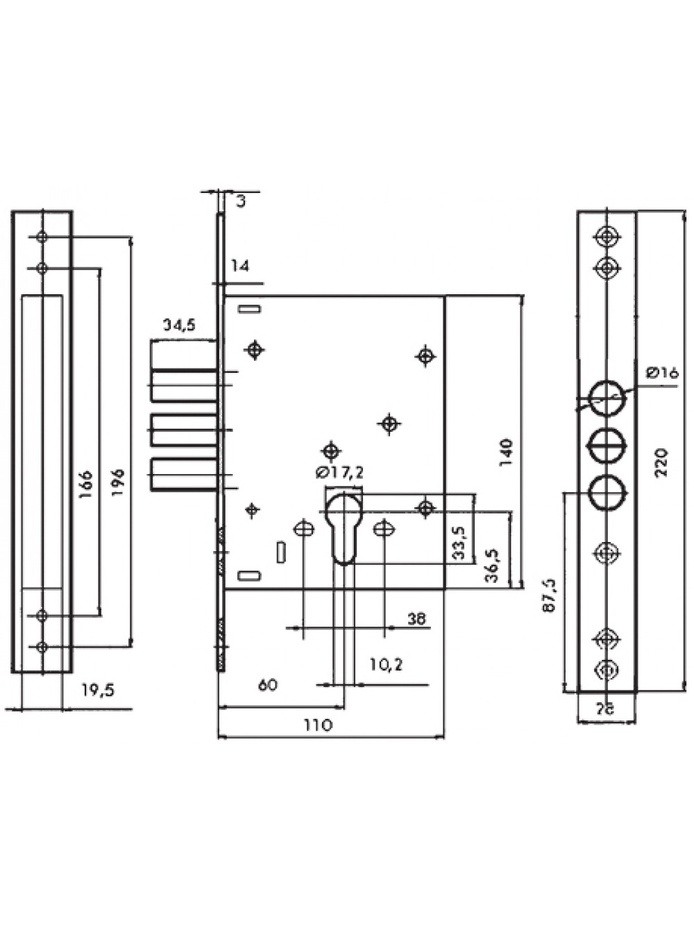Виробник – Mul–T–Lock Країна виробник – Ізраїль Розміри замку – 140x110x19,5 мм Торцева планка – 220×28 мм Backset – 60 Виліт ригелів – 34,5 мм Діаметр ригеля – 16 мм Покриття – нікель Комплектація: корпус замка відповідна планка Стягнутий гвинт для ЦМ упаковка