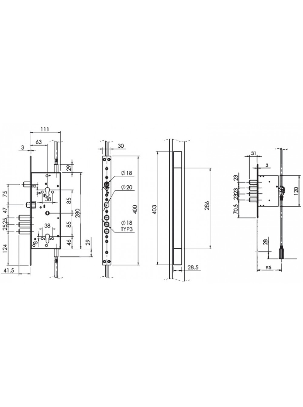 – 4 сталевих ригеля – 18 мм., Вихід ригелів – 30 мм.