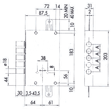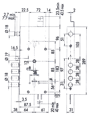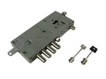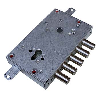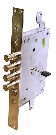 Основной сувальдный замок с креплением за лицевую планку и дополнительными тягами для многостороннего запирания. 4 ригеля диаметром 18 мм. Удобен в заменах других замков подобного типа ведущих итальянских производителей.