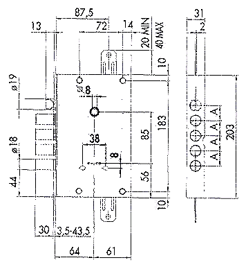 Врезной двойной двух цилиндровый замок. Может быть исполнен как в зависимом так и в независимом варианте. Зависимый вариант - замки необходимо открывать и закрывать в определенной последовательности. Один замок блокирует другой. В независимом варианте - замки работают раздельно.